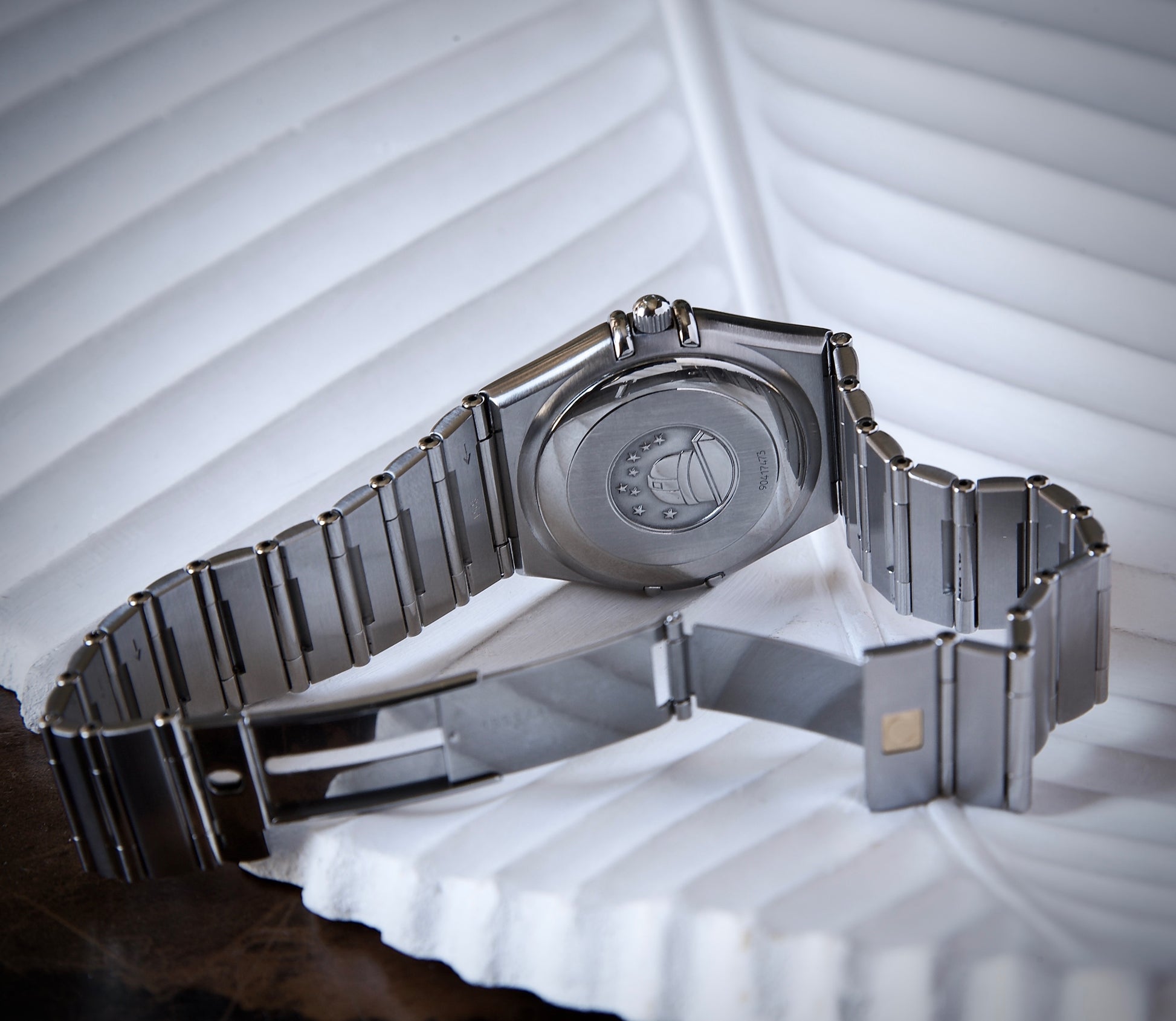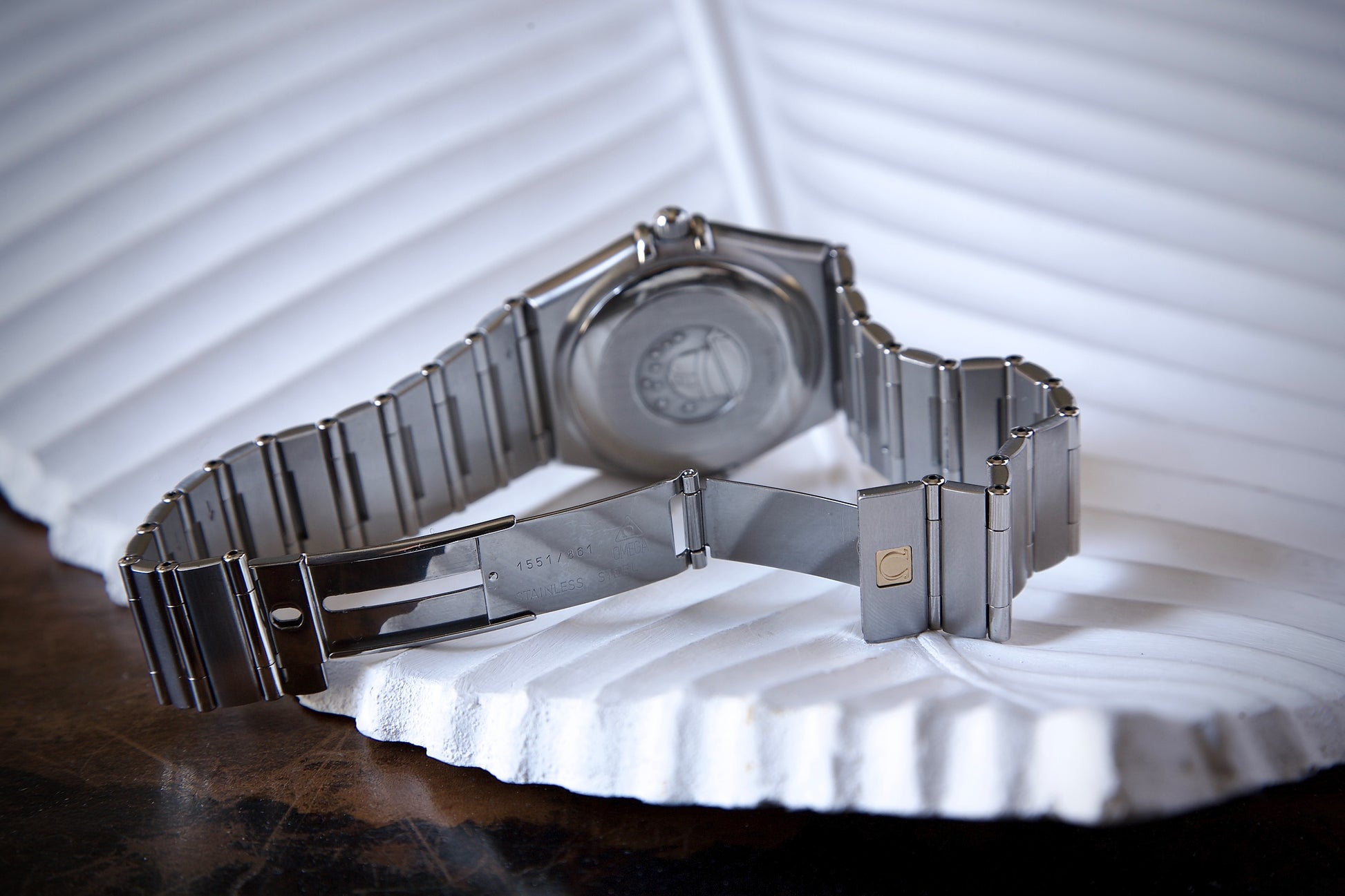 The 36 mm stainless steel case (excluding the crown) offers classic and elegant proportions. Its original Omega steel bracelet features a gold clasp, maintaining the essence of discreet luxury characteristic of the Constellation collection. The back features the iconic observatory with eight stars, a seal of authenticity and prestige for the line.