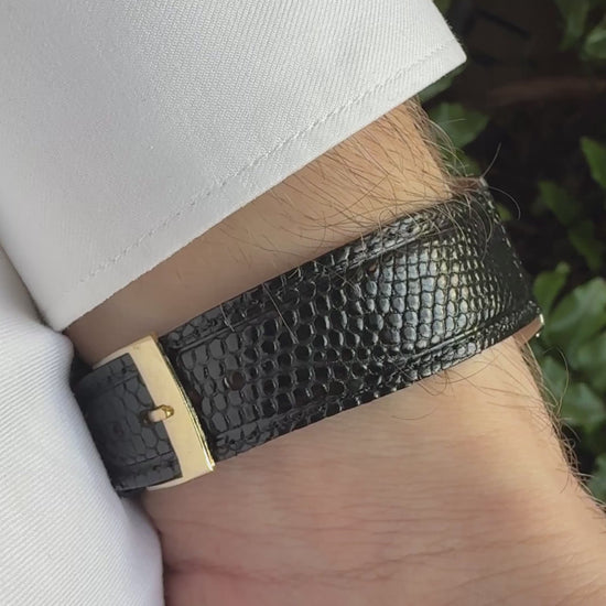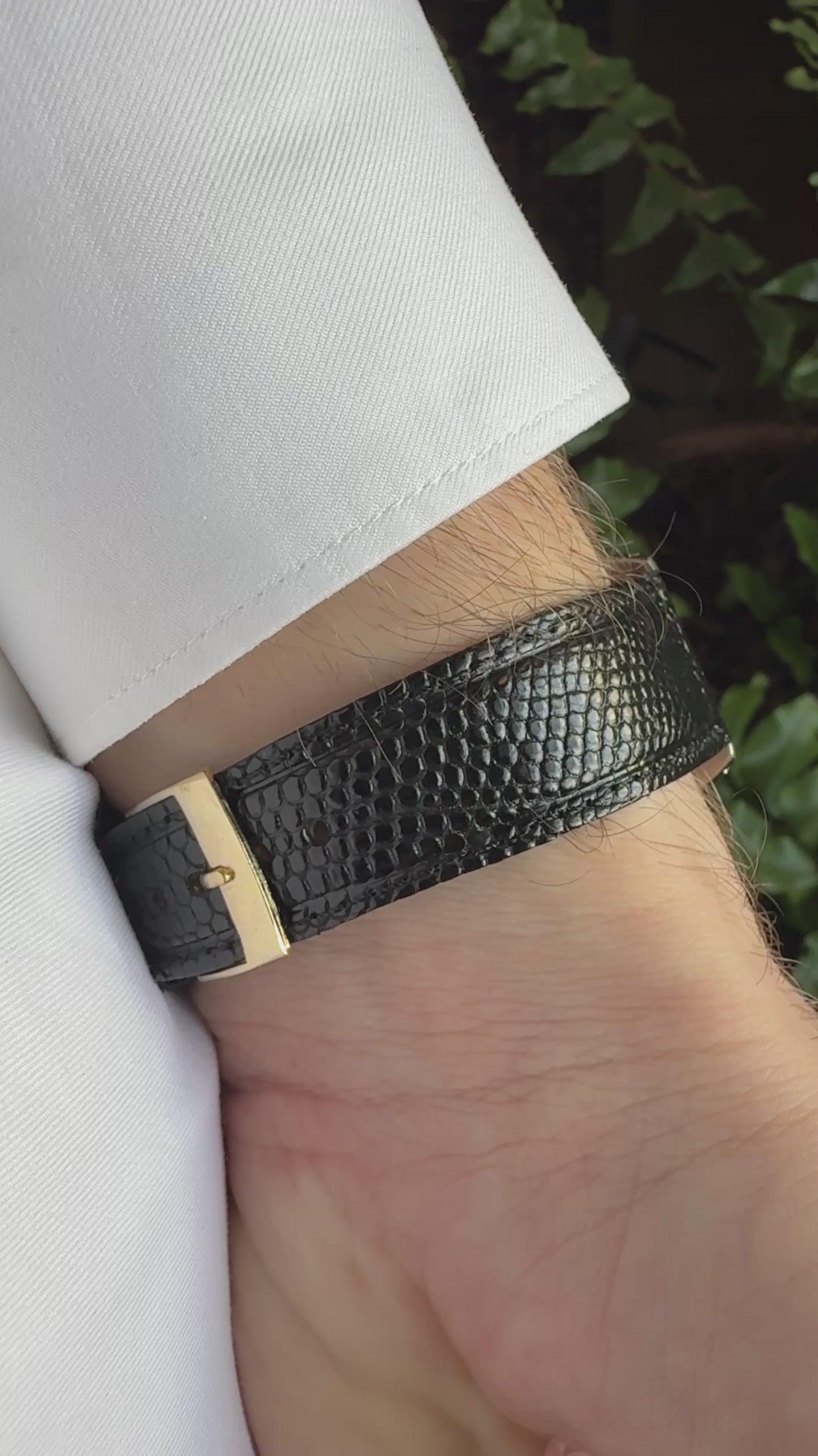 The watch is fitted with a black leather strap, adding a touch of elegance and making it perfectly suited for both daily wear and more formal occasions.