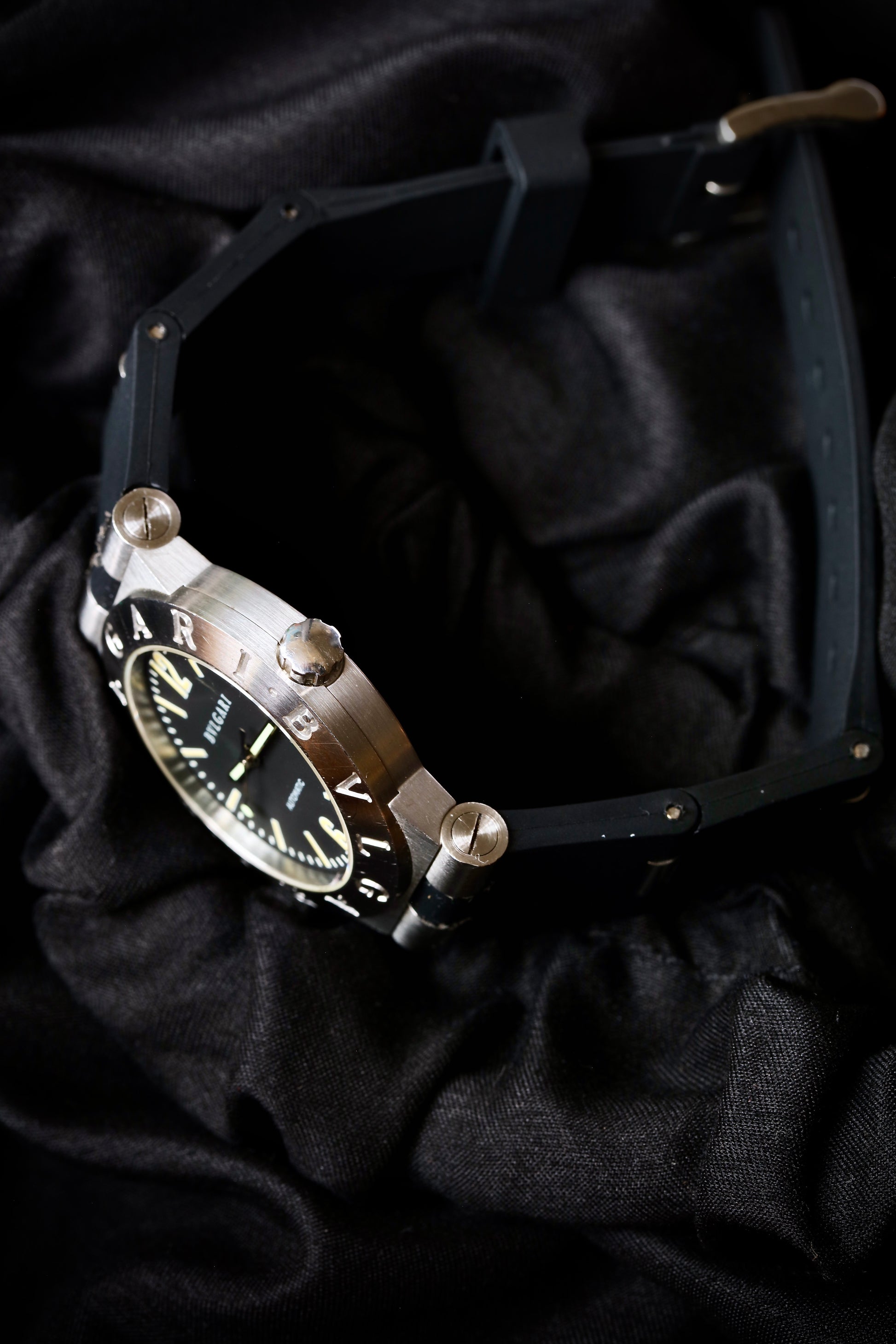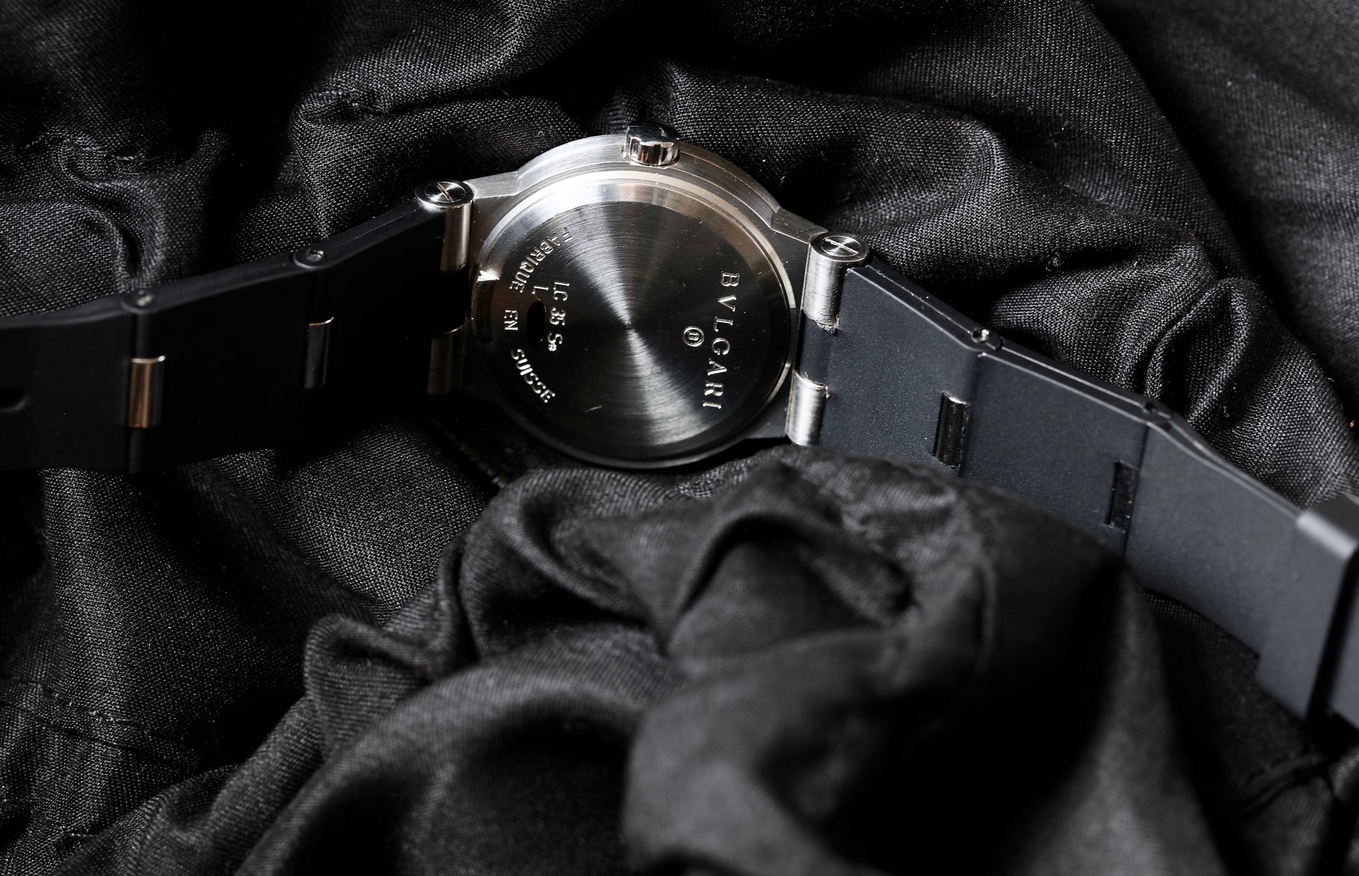 Este modelo destaca por su esfera negra clásica de Bvlgari, con números arábigos a las 12 y a las 6, un diseño limpio y altamente reconocible.