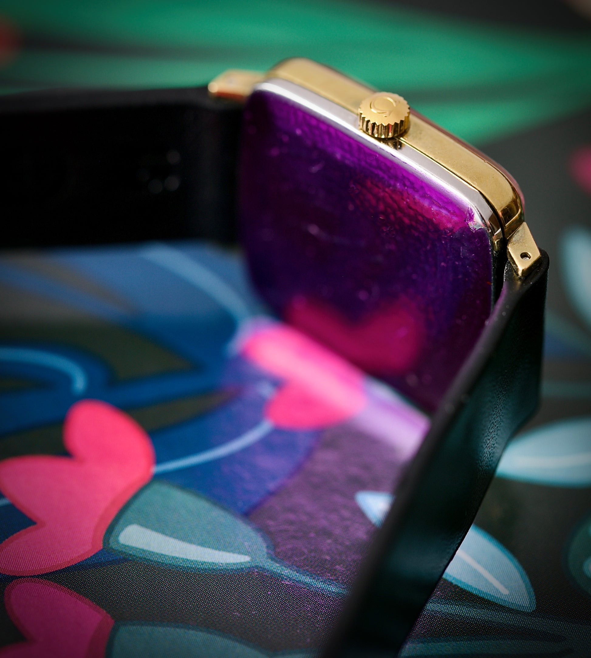 Su caja cuadrada chapada en oro, con unas dimensiones de 28 x 28 mm sin contar la corona, aporta una estética muy marcada y elegante, típica del diseño de finales de los años 70. Aunque originalmente se concibió como un reloj de mujer, su diseño limpio y sus proporciones permiten que también pueda ser llevado perfectamente por un hombre que busque un reloj vintage distinto y con personalidad.